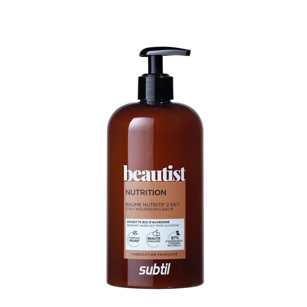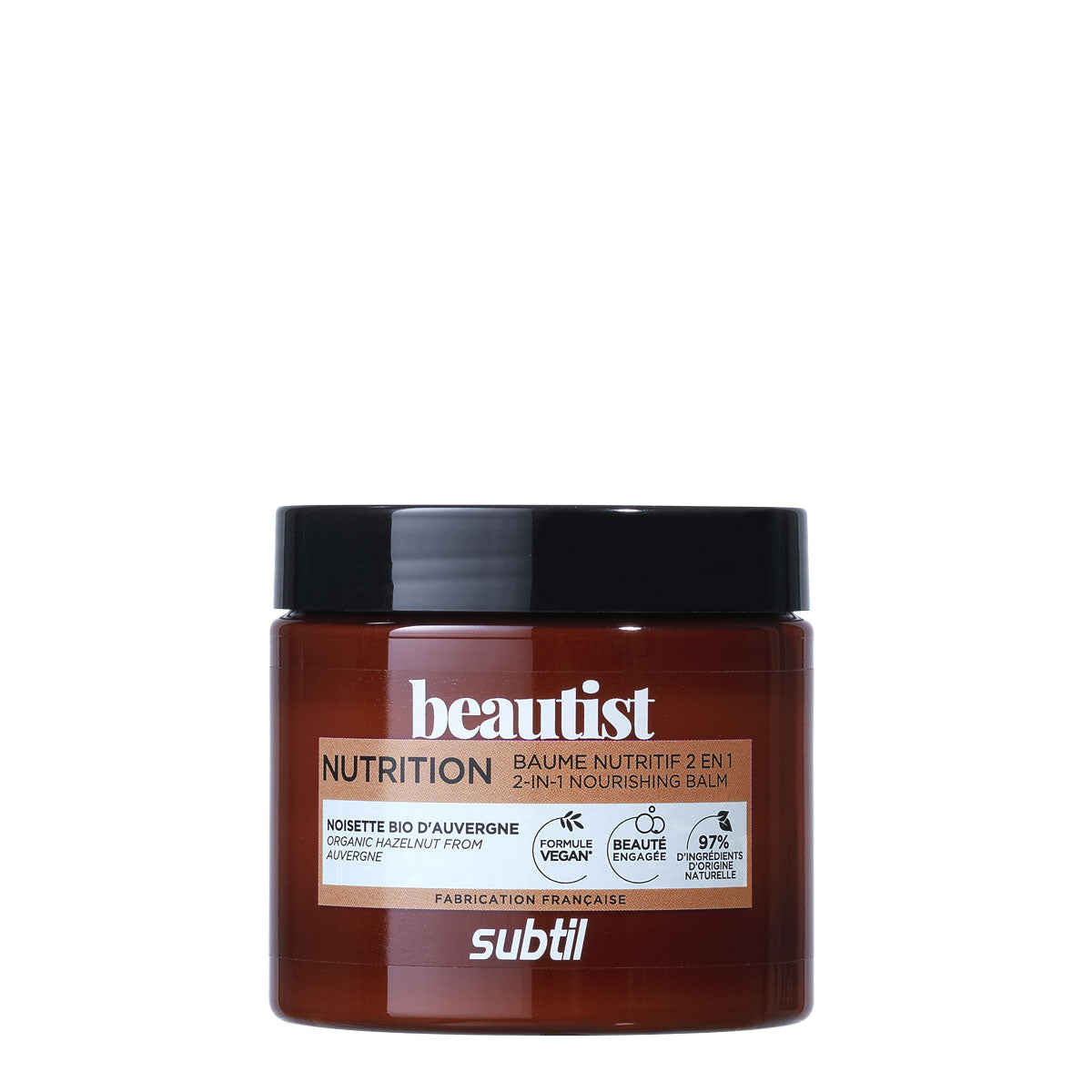Découvrez le baume nutritif 2 en 1 de la gamme Beautist de chez Subtil. Formulé à partir de 97% d'ingrédients d'origine naturelle, donc la noisette BIO, au fort pouvoir nutritif. Ce baume est fabriqué en France, repecte les cheveux et la planète.