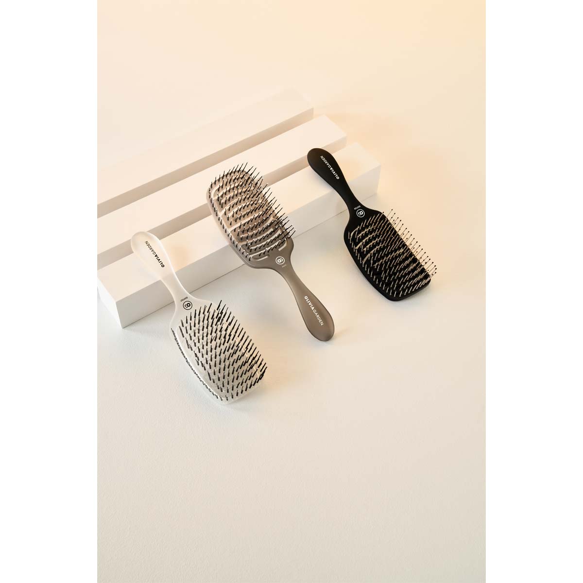 Découvrez la brosse Essential Care Flex Matt Black pour cheveux épais de la marque Olivia Garden. Conçue pour un démêlage sans douleur grâce à ses poils innovants.