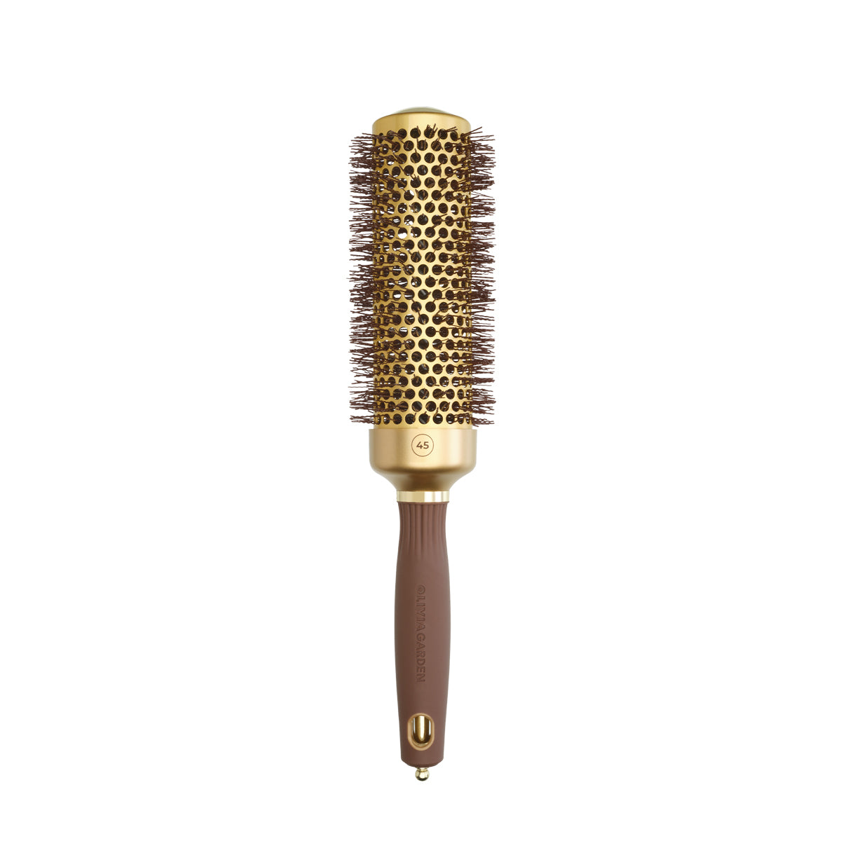 Découvrez la brosse Expert Blowout Speed Gold & Brown de la marque Olivia Garden. Elle permet un séchage 25% plus rapide grâce à une répartition uniforme de la chaleur. Corps en céramique, poils ondulés, cette brosse réduit les frisottis et permet de faire un brushing en un temps record.