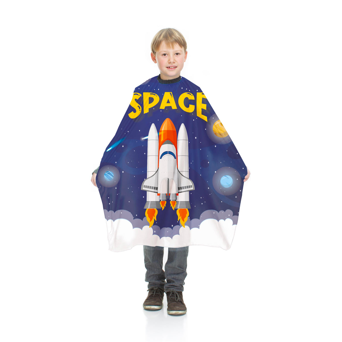 Non seulement l'enfant sera protégé, afin d'éviter qu'il ait ses vêtements remplis de cheveux, mais en plus il sera ravi de porter une fusée ou une licorne sur lui. Pour que tout se passe bien lors de la coupe de cheveux, cette cape pour enfant est essentielle.