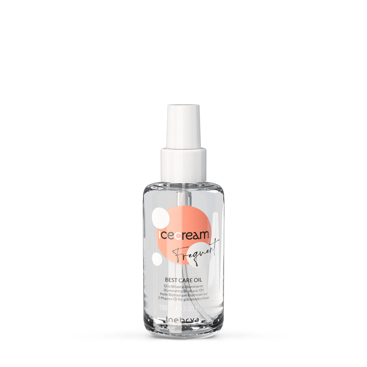 Découvrez l'huile Best Care Oil de la gamme Ice Cream de chez Inebrya. Une huile qui va hydrater et faire briller les cheveux, tout en éliminant les frisottis. Les cheveux seront d'une étonnante douceur, sans être alourdis.