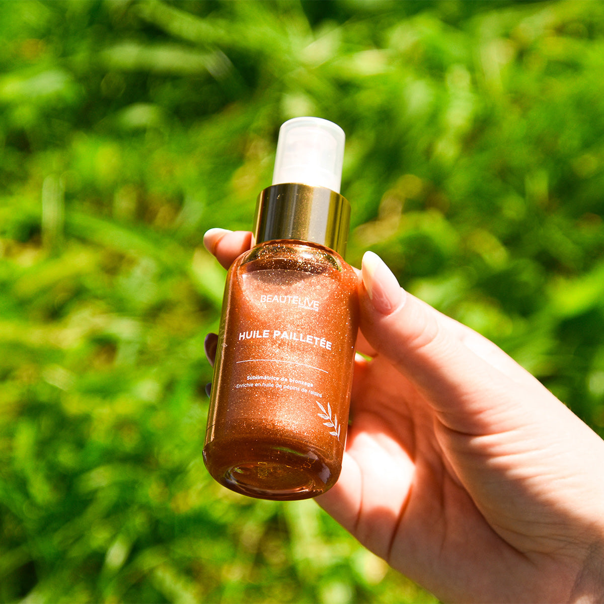 Découvrez l'Huile pailletée de la marque Beautélive. Une huile qui sublimera votre bronzage, enrichie en huile de pépin de raisin.