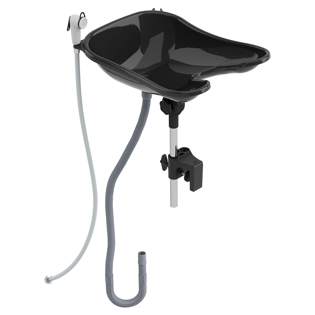 La cuvette noire est basculable pour s'adapter parfaitement à la nuque de votre cliente. Grâce à sa douchette livrée avec le bac, qui se fixe à un robinet, vous pourrez faire les shampoings ou rincer une couleur en toute tranquillité. Avec son tuyau d'évacuation, les eaux usées pourront se déverser dans la baignoire ou le lavabo.
