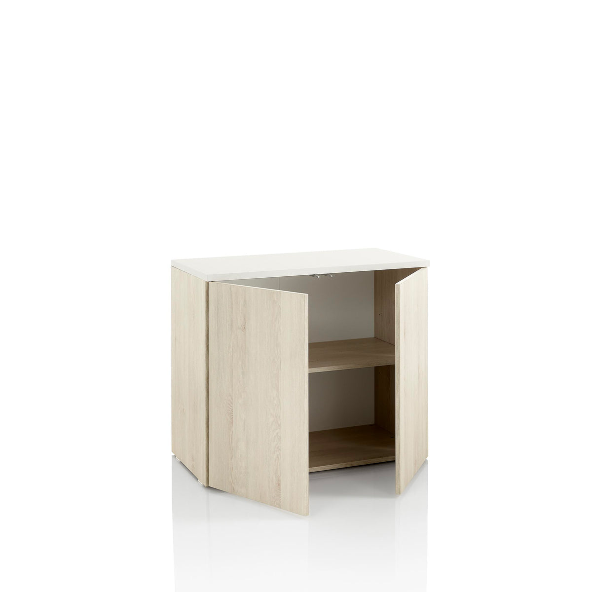 Ce meuble de rangement est conçu pour s'adapter à tous les styles d'intérieur. Le mélange du bois de mélèze naturel et de la mélamine blanche lui confère un look à la fois chaleureux et contemporain. Les portes push-pull ajoutent une touche de modernité et facilitent l'ouverture.