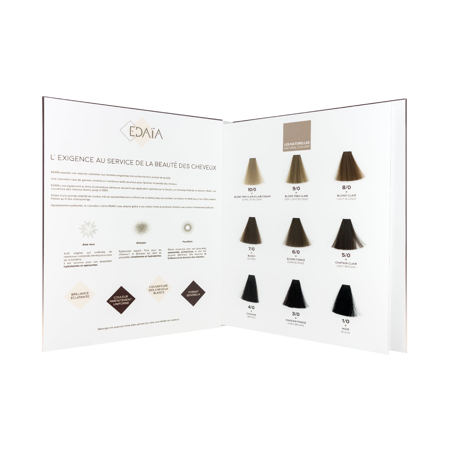Grâce à ce nuancier, vous pourrez faire votre choix parmi les 64 magnifiques teintes de la coloration EDAÏA délicatesse de crème !