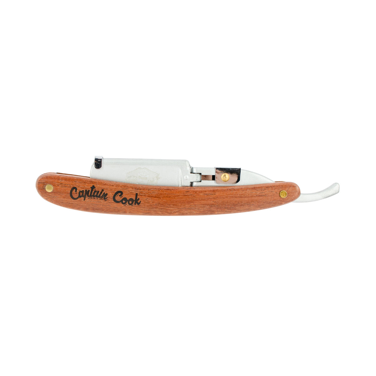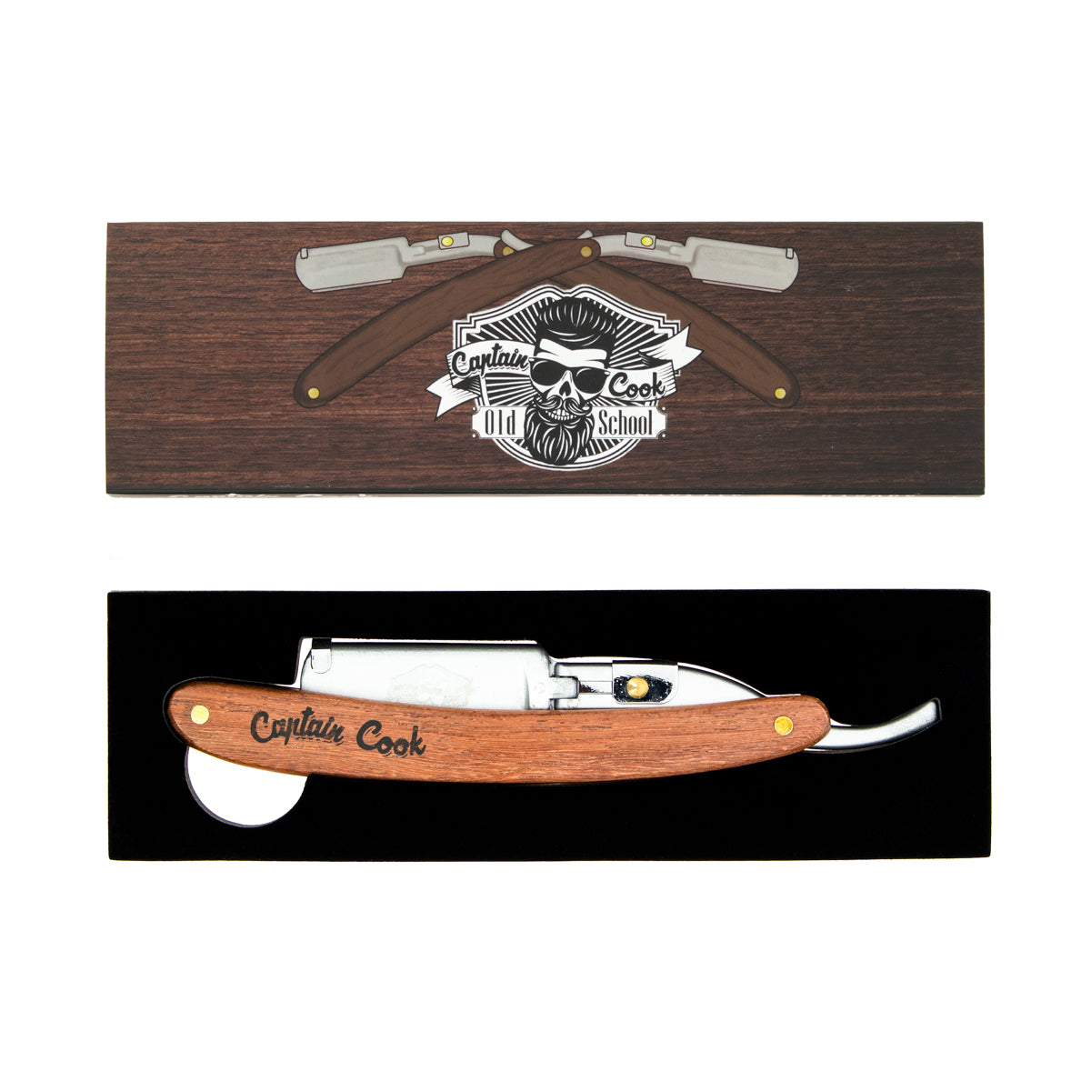 Découvrez le rasoir barbier avec son manche en bois de la marque Captain Cook, son look old school saura rapidement se faire adopter pour un rasage "à l'ancienne". Vous trouverez une tête de mort gravée sur le porte-lame ainsi que la marque sur le manche en bois.