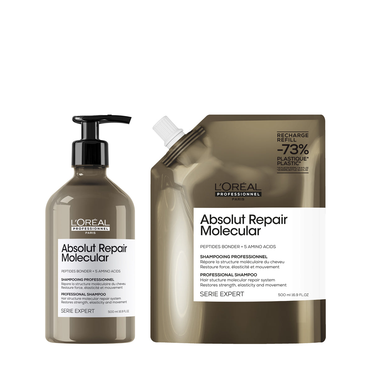 Découvrez le shampoing Absolut Repair Molecular en version recharge. Répare vos cheveux en profondeur, qui seront plus forts et plus brillants.