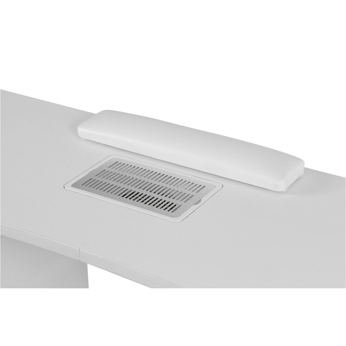 De plus, cette table est équipée d'un aspirateur qui vous permettra d'aspirer les poussières d'ongles ou de gel lorsque vous travaillez. Ce qui évitera que la poussière ne vole un peu partout dans votre institut de beauté. Et bien sûr, pour que la cliente soit bien installée et pour vous aider dans votre manucure, cette table est livrée avec un appui main.