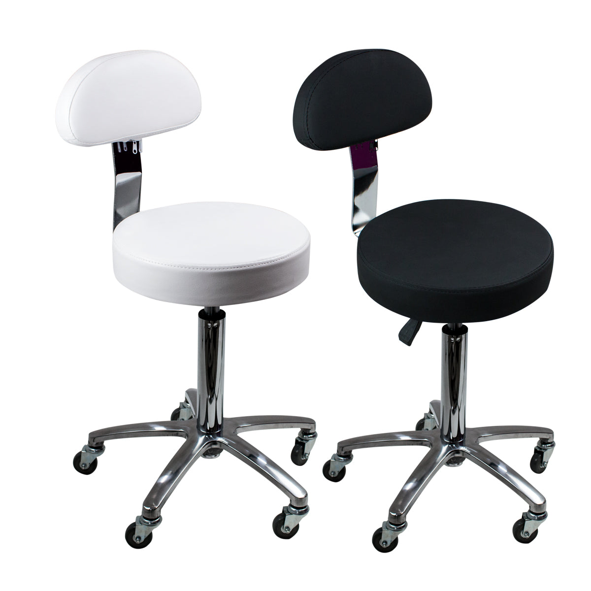 Tabouret de coiffure ou d’esthétique avec dossier pour encore plus de confort lors de l’assise.