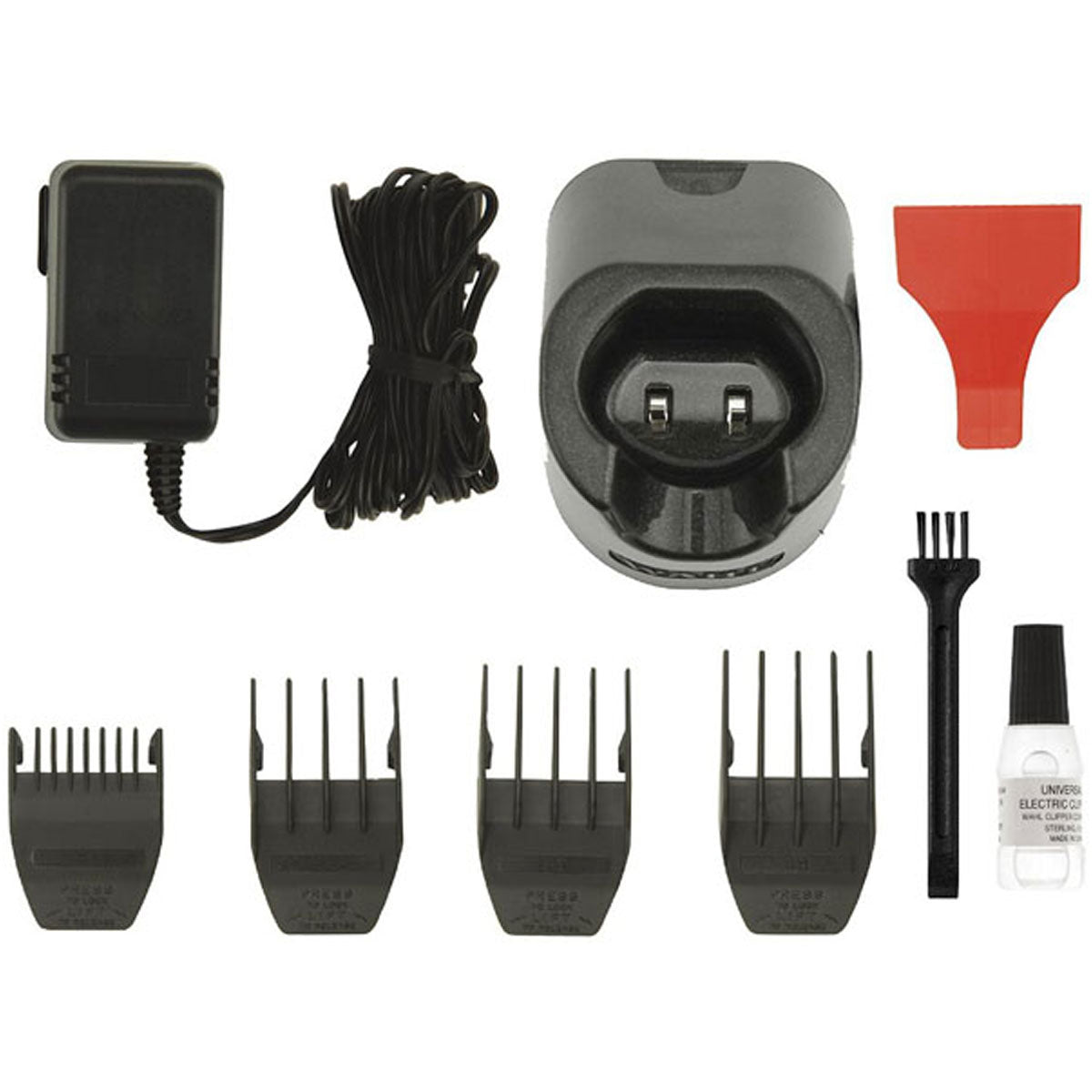 Livrée avec : 1 socle de charge, 1 transformateur (fil de 2,3m), 4 peignes (2,5 / 6 / 9 et 11mm), 1 brosse de nettoyage et 1huile lubrifiante.