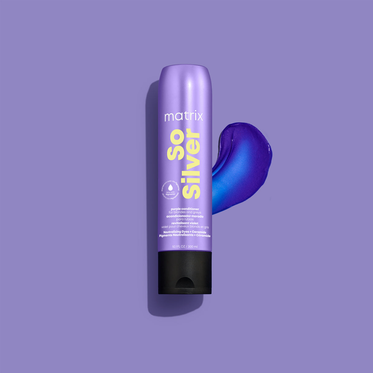 Optez pour le Conditioner Pigmenté So Silver de Matrix pour neutraliser les reflets jaunes des cheveux blonds.