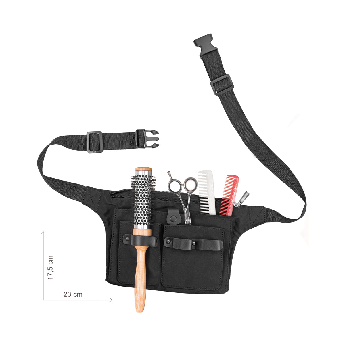 Elle s'attache à la taille, et est réglable. Munie de plusieurs poches, vous pourrez y mettre brosses, peignes, ciseaux. Elle est même munie d'une poche à fermeture éclair, où vous pourrez y mettre vos pinces et autre petit métériel. Elle a une taille assez grande, 23cm, pour mettre le plus possible d'outils et ne pas avoir besoin de se déplacer.