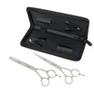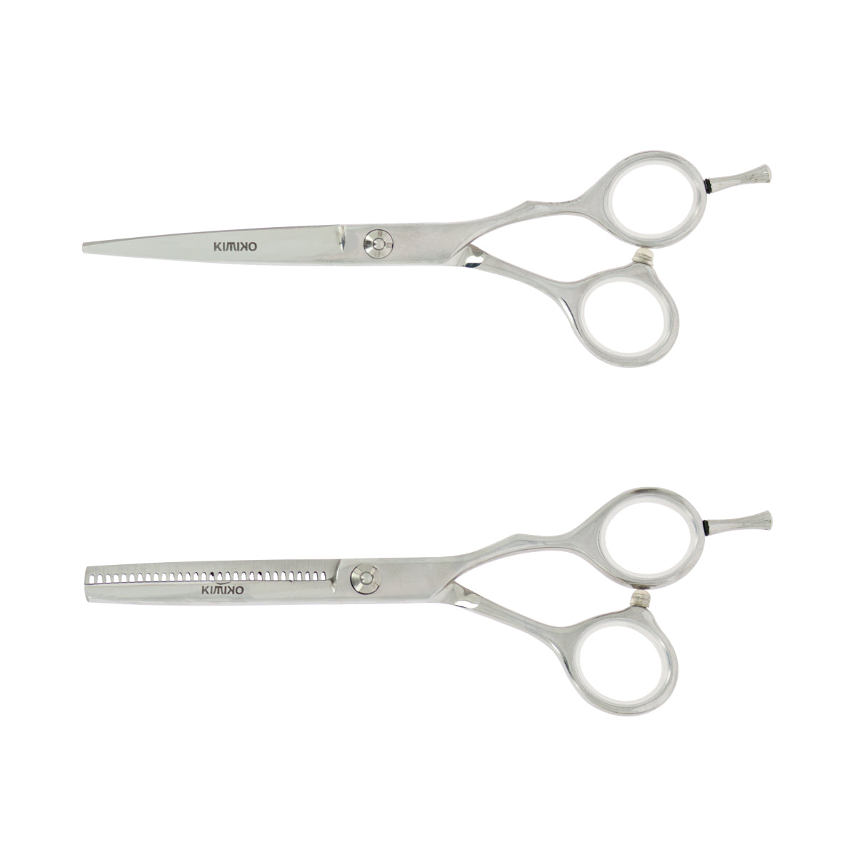 Découvrez la trousse de ciseaux de la gamme KIMIKO. Une paire de ciseaux de coupe et un sculpteur d'une taille de 5.5 et ergonomiques, pour droitiers. Les lames sont en acier japonais pour une meilleure qualité de coupe.